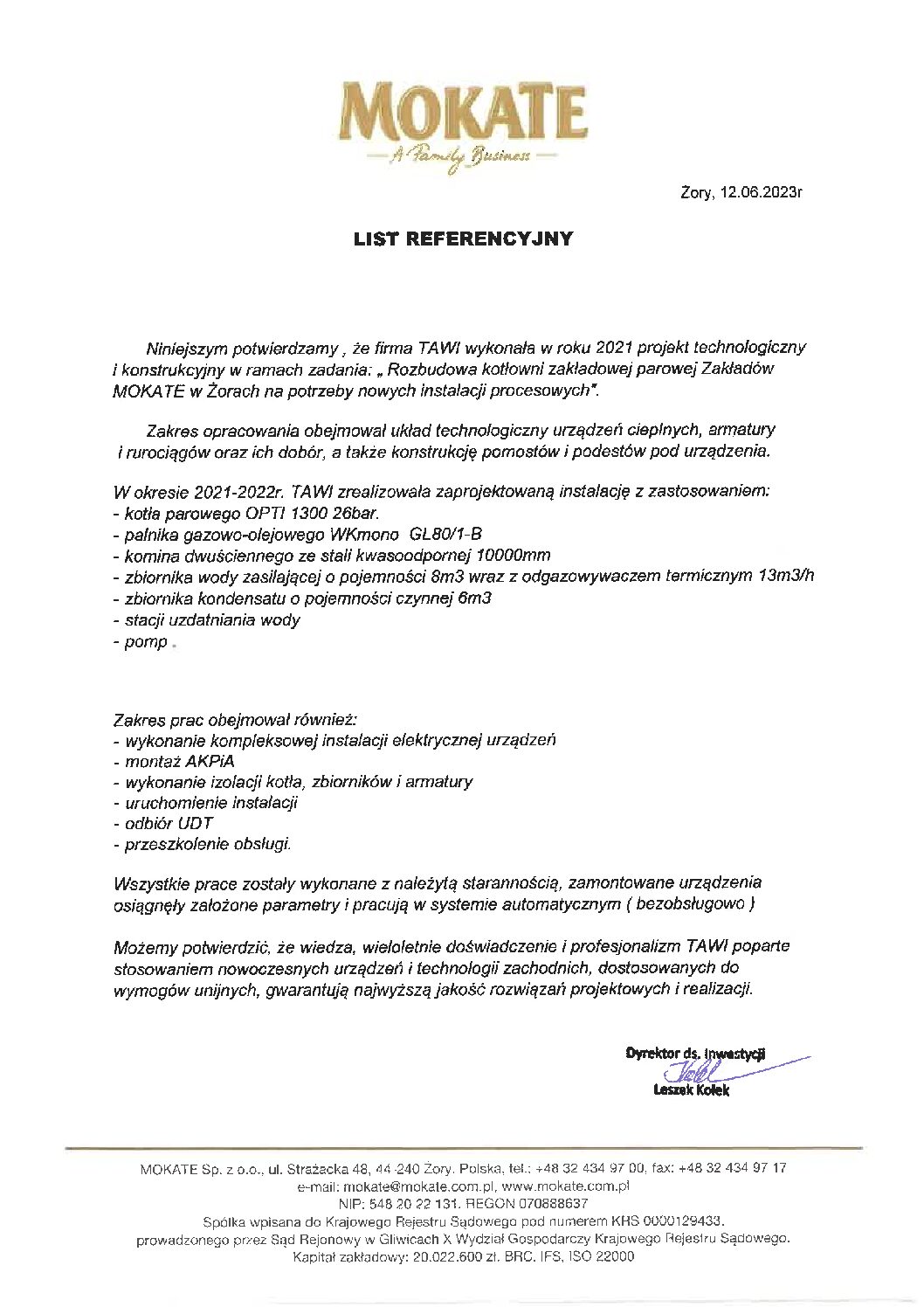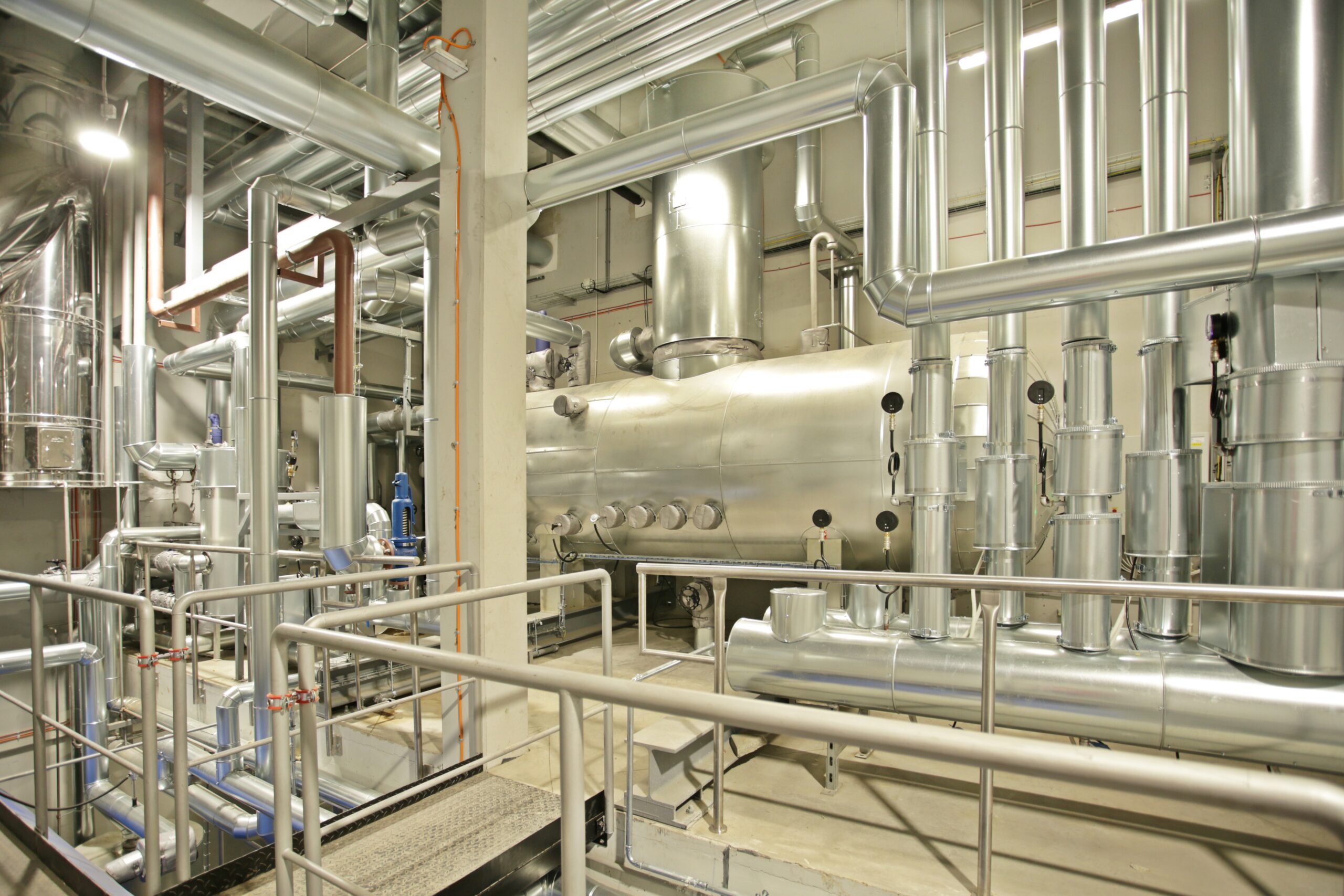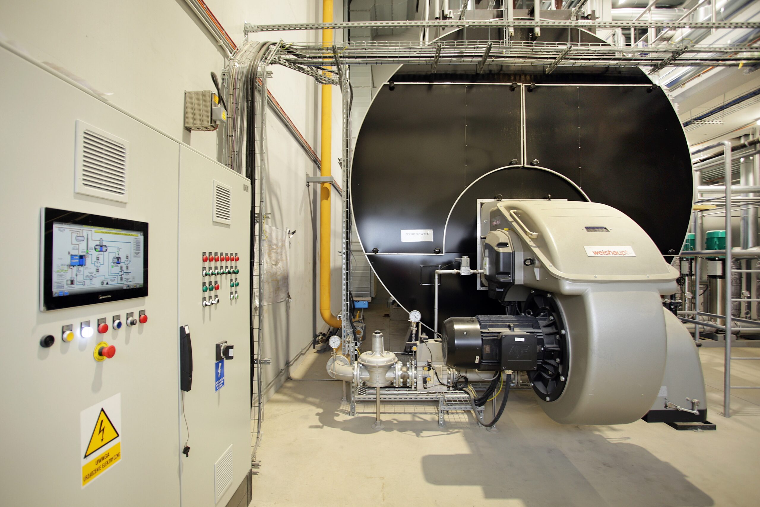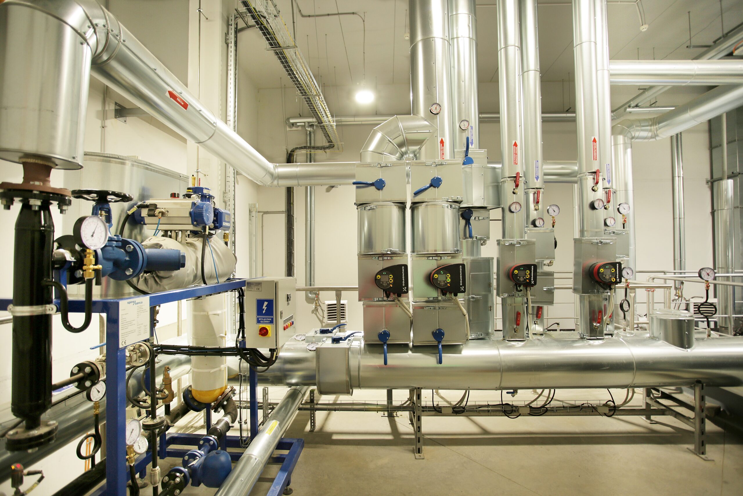 Zrealizowano kompleksowy montaż układu wytwarzania pary o łącznej przepustowości 13 t/h. Prace obejmowały posadowienie wydajnych jednostek ciśnieniowych wraz z dedykowanymi palnikami oraz systemem odprowadzania spalin z odzyskiem ciepła. Wybudowano magistrale rurociągów dystrybucyjnych, wielostopniową stację przygotowania i termicznego odgazowania wody zasilającej oraz układ zbiórki kondensatu. Całość zintegrowano z zakładowym systemem sterowania, co umożliwia precyzyjną regulację ciśnienia roboczego bezpośrednio z dyspozytorni. Włączenie nowego węzła do istniejącej sieci wewnątrz hal produkcyjnych przeprowadzono z pełnym zachowaniem reżimu ciągłości pracy żorskiej fabryki.
